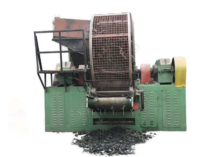Um triturador pesado que reduz blocos de pneus em pequenos pedaços de borracha para moagem adicional.